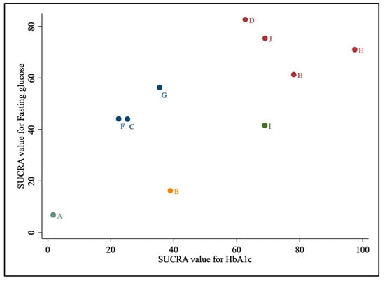 To compare the effects on glycemic control (changes in HbA1c and fasting glucose) between the dietary patterns, we used STATA version 16.0 (Stata Corp., College Station, TX, USA) (network package []) and produced presentation tools with the network graphs package []. Calculations were fitted in a frequentist framework. Direct comparisons between different dietary approaches were illustrated by using a network diagram [], where the size of the nodes was proportional to the sample size of each dietary intervention and the thickness of the lines was proportional to the number of studies available. Heterogeneity was tested by Cochran’s Q test. I² of >50% was considered as substantial heterogeneity. Random-effects models were used to analyze the association between the dietary approaches and glycemia if I² > 50%, while fixed-effects models were applied if I² ≤ 50%. An indirect effect estimate was then calculated by comparing two interventions, and the control group was a common comparator. The outcomes were reported in terms of mean difference between the two interventions with a corresponding 95% credible interval (CI). The surface under the cumulative ranking curve (SUCRA) was used to estimate the ranking probabilities of the intervention effect. We constructed a cluster plot of SUCRA values for HbA1c and fasting glucose to assess both outcomes simultaneously.