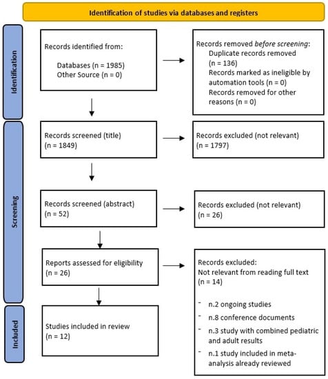 A total of 1985 articles were identified through the database searches: 46 from PubMed, 505 from Embase, 17 from CINAHL, and 1417 from the Cochrane Library. After removing 136 duplicate articles, all titles were screened, and 52 articles were retained as eligible based on reading the abstracts. Of these, 26 were deemed irrelevant, leaving 26 full-text articles for evaluation. Ultimately, 12 studies were included in this review, while 14 references were excluded. The excluded references consisted of ongoing studies, conference documents, or studies that included both pediatric and adult populations (Figure 1).