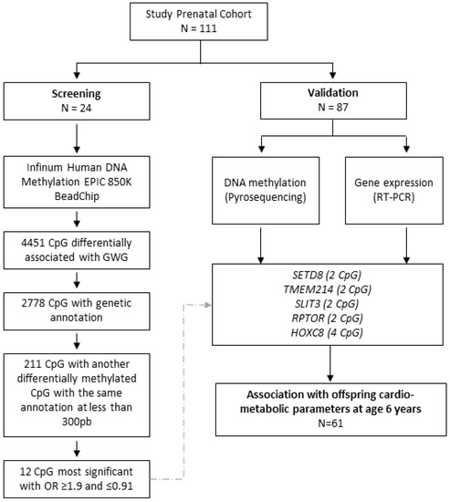- Kawai, T.; Yamada, T.; Abe, K.; Okamura, K.; Kamura, H.; Akaishi, R.; Minakami, H.; Nakabayashi, K.; Hata, K. Increased epigenetic alterations at the promoters of transcriptional regulators following inadequate maternal gestational weight gain. Sci. Rep. 2015, 5, 14224. [Google Scholar] [CrossRef] [PubMed]