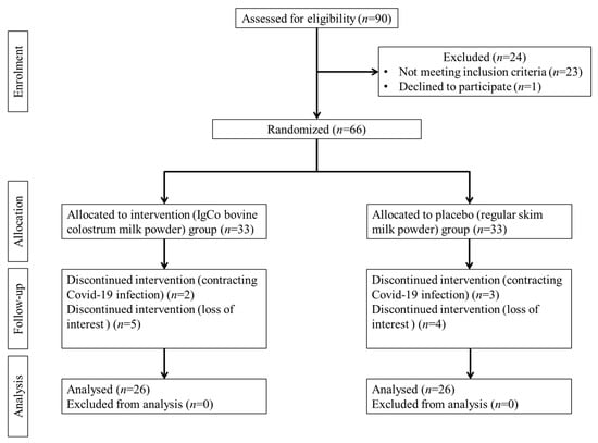 The consort study flow chart. After screening for eligibility, a total of 66 participants who agreed to participate in the study were randomized into the IgCo bovine colostrum supplement group (n = 33) and the placebo group (n = 33), respectively. There were 14 dropouts, with seven each in both the intervention and placebo groups during follow-up. Hence, only 52 participants (n = 52) were included in the analysis, with 26 participants in the intervention and placebo groups, respectively.