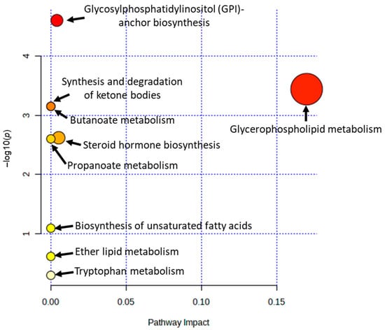 The summary of pathway analysis with the MetPA system (MetaboAnalyst 5.0). The metabolic pathways were represented as circles according to their –log(p) value at the y-axis and their pathway impact at the x-axis. The darkness and size of each circle corresponds to the –log(p) value and impact score of the metabolic pathway, respectively.