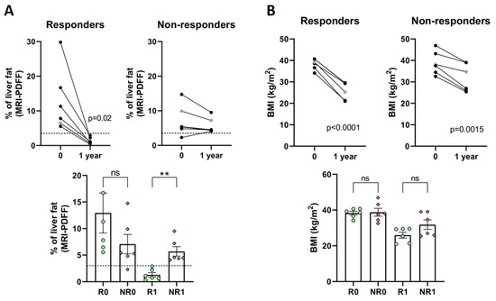 Changes in % of liver fat (A) and in BMI (B) in responder (R) and non-responder (NR) BS patients. Upper panels: black dots, Caucasian; grey dots, Amerindians. Lower panels: green dots, responders; red diamonds, non-responders; dotted line in (A), MRI-PDFF cut-off value for no steatosis (S0). Analyses were performed at the time of surgery (R0 and NR0) or one year later (R1 and NR1). Paired (upper panels) or unpaired (lower panels) t-tests were applied to determine statistical significance; ** p < 0.01, ns: no significance.