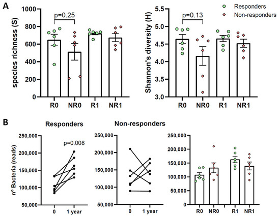 The total number of bacteria showed a significant increase in responders from time 0 to one year (Figure 2B). However, no significant differences were observed between responders and non-responders (R0 vs. NR0, or R1 vs. NR1).