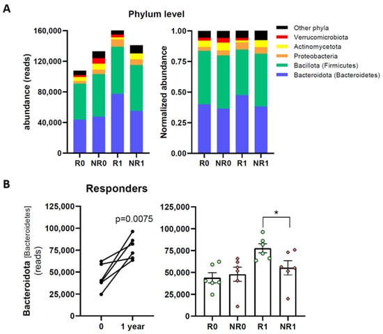 Fecal microbiota phyla in responder and non-responder BS patients. (A) Stacked bar chart of the more abundant phyla. (B) Abundance of phylum Bacteroidota. Analyses were performed at the time of surgery (R0 and NR0) or one year later (R1 and NR1). Green dots, responders; red diamonds, non-responders. Paired ((B) left) or unpaired ((B) right) t tests were applied to determine statistical significance; * p < 0.05.