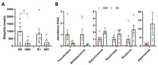 Comparative analyses between responders and non-responders showed that, at the time of surgery (t = 0), there were only two genera with greater abundance in R0 vs. NR0: Parabacteroides and Bilophila (Table 2). Bilophila also maintained a greater abundance in R1 vs. NR1 (3.5-fold), although without statistical significance (Figure 4A).