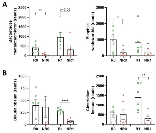 Fecal bacterial species in responder and non-responder BS patients. (A) Representative species showing significant differences at time 0. (B) Representative species showing significant differences one year after BS. Analyses were performed at the time of surgery (R0 and NR0) or one year later (R1 and NR1). Green dots, responders; red diamonds, non-responders. Statistical significance was determined by unpaired t-tests; * p < 0.05; ** p < 0.01; **** p < 0.0001.
