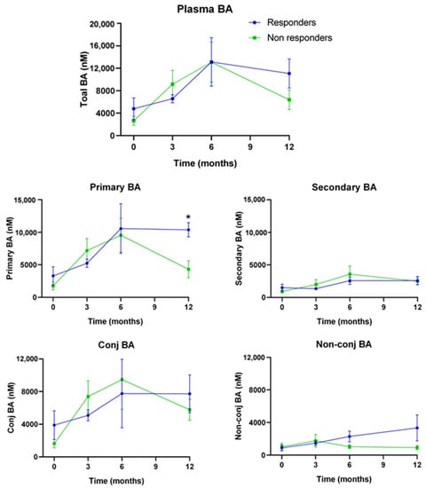 The results in Figure 6 demonstrate that all patients had an increase in the concentration of plasma BA during the first 6 months after BS, with primary and conjugated BA being responsible for most of this increase. However, from 6 to 12 months after BS, non-responder patients reduced their plasma BA concentrations, whereas responders maintained higher levels. This led to a significantly higher plasma concentration of primary BA in responders 12 months after BS (2.4-fold) (Figure 6, Primary BA). In addition, non-conjugated BA increased steadily in responders, reaching, at month 12, a level 3.6 times higher than in non-responders (Figure 6, Non-conj. BA). The difference is even larger if only primary non-conjugated BA are taken into consideration. In this case, the level in R, at month 12, was 8.2-fold higher than in NR (p = 0.099).