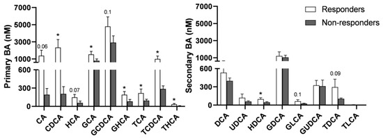 A more detailed analysis of BA species at month 12 demonstrated that all primary BA (both non-conjugated and conjugated) had a significantly higher plasma concentration in responders. The highest differences were observed in non-conjugated cholic acid (CA) and chenodeoxycholic acid (CDCA), which were 7- and 11-fold higher, respectively, in responders (Figure 7, left). The levels of secondary BA were much more similar in both groups (Figure 7, right).