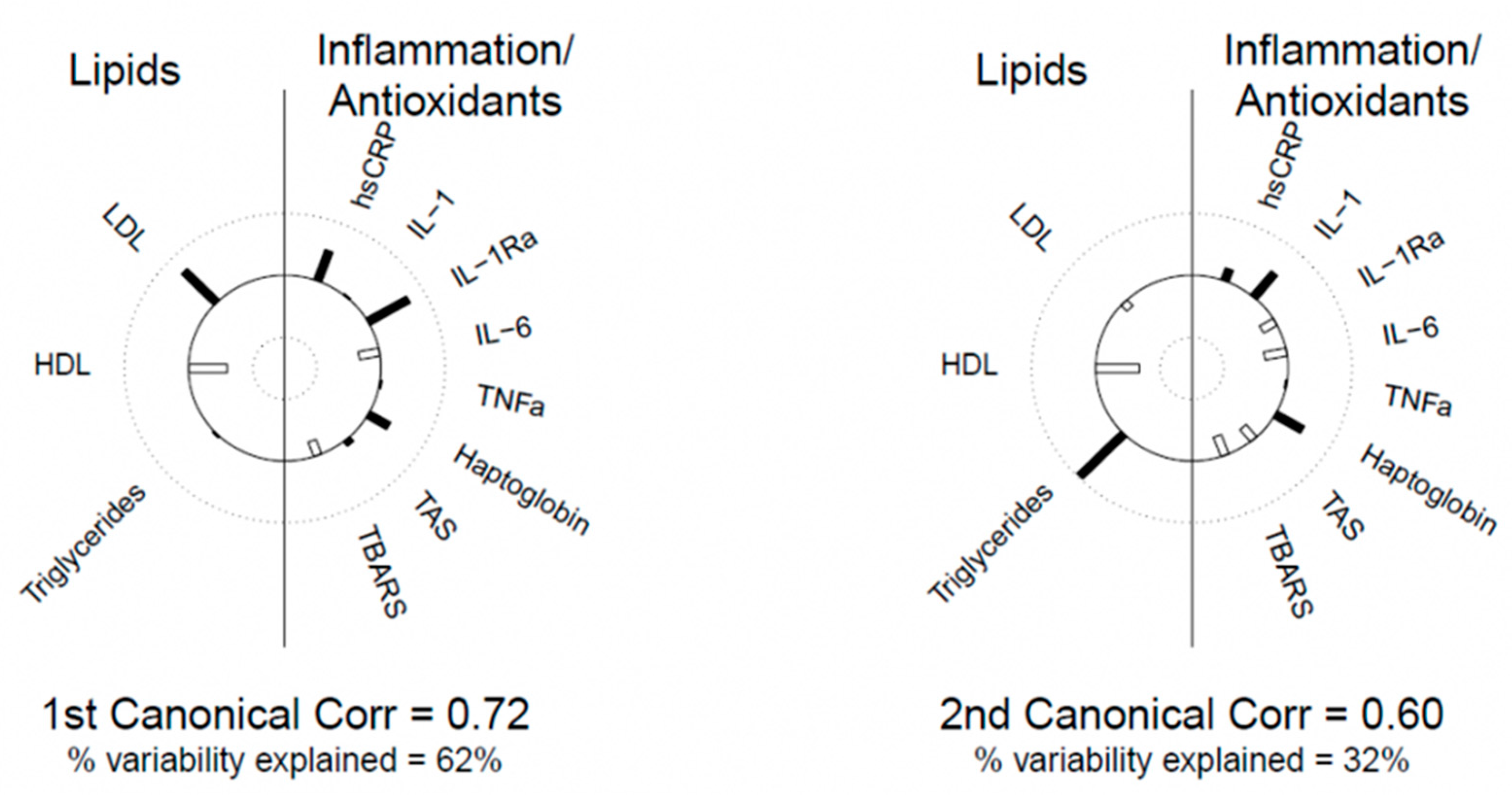 The 1st canonical variate for lipids was highly correlated with LDL-C (r = 0.715); thus, this variate was most represented by LDL-C. The 2nd canonical variate is most represented by triglycerides (r = 0.971) and both variates were negatively correlated with HDL (r = −0.605 and −0.674, respectively). For inflammation, the 1st canonical variate was represented by hsCRP and IL-1Ra, and the 2nd variate is represented by IL-1, haptoglobin, and, to a lesser degree, IL-6, and TBARS. Helioplots showing correlations between canonical variates and their components are shown in Figure 2.