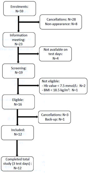 Figure 2 shows a flowchart diagram of the participant selection via a screening procedure (as described in Section 2.2). All 12 participants (6 males and 6 females) completed the study. Their mean age was 24 ± 2.8 years (range: 20–30 years), and their mean BMI was 23.3 ± 3.0 kg/m2 (range: 20–28 kg/m2).