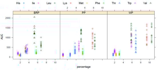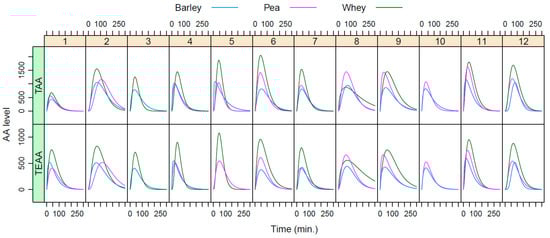 Statistical analyses were performed using R statistics (R Foundation for Statistical Computing, Vienna, Austria) and IBM SPSS Statistics (Version 25.0. Armonk, NY, USA). The concentration of 19 individual free AA was quantified, and analysis was performed on the individual AA, total AA (TAA), and a total of nine essential AA (TEAA; Val, Trp, Thr, Phe, Met, Lys, Leu, Ile, and His). The time curves for postprandial AA levels in the blood of the twelve participants were fitted using the R-package ‘aaresponse’ specifically designed for analyzing AA response curves in cross-over intervention studies as previously described []. In cases where no peak was observed, data for peak height and iAUC were imputed, i.e., estimated from the raw data without curve fitting. This leads to unbiased estimates since non-responses are also taken into account, as well as more narrow confidence intervals. Corresponding estimates for time-2-max cannot be obtained because, in the absence of a peak, the peak position is undefined. A linear mixed model was used to compare the incremental area under the curve (iAUC), maximum peak height, and time to reach this maximum peak value (time-2-max) for the three protein powders, using BRP as a reference to compare the response of BRP to another often used plant protein source (pea), but also to compare the results against the commonly used and high-quality animal protein source whey (as a benchmark). This model comprised fixed effects for protein intervention and test week and a random effect for participants. The Kenward–Roger F test was used to assess the significance of the protein intervention effect. The differences between the 19 individual AA were explored by making use of descriptive analyses (mean differences + SD).
