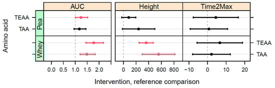 Confidence intervals for all comparisons of individual amino acids, after imputation compared to BRP. In cases where no peak was observed, data for the incremental area under the curve (iAUC) peak heights were imputed from the raw data without curve fitting. For the iAUC, the comparison is the ratio between the iAUC values of PP and WP intervention and the BRP intervention; for the peak height and time-2-max the comparison is given by the absolute differences (µM or min). Red bars indicate significant differences (p < 0.05) compared to the BRP intervention, black bars indicate no statistically significant difference (p > 0.05).