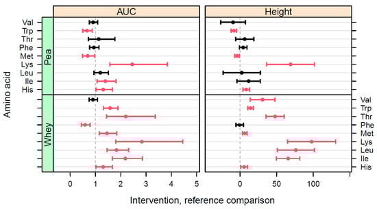 Confidence intervals for comparisons in iAUC and a peak height of individual EAA between the PP and WP interventions on the one hand and BRP as a reference on the other. For iAUC, the comparison is the ratio between the iAUC values (dimensionless); for the peak height, the comparison is given by the absolute differences (µM). Red bars indicate a statistically significant difference (p < 0.05), black bars indicate no statistically significant difference (p > 0.05).