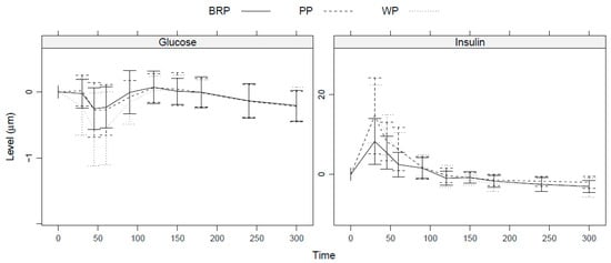 The postprandial insulin peak is lower for BRP than for WP and PP, see Figure 7. In contrast, the postprandial drop in glucose for BRP is similar to the drop seen for PP, while WP shows a larger drop in postprandial glucose levels. However, differences in iAUC and peak height were insignificant at the 5% level for both glucose and insulin.