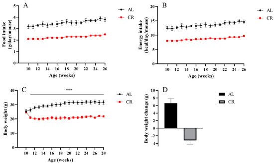Effects of CR on body weight change in mice. (A) Food intake, (B) energy intake, and (C) body weight were measured weekly throughout the experimental period. (D) The average body weight change at the end of experiments. n = 10 per group. Data are shown as the means ± SD. *** compared to the AL group, p < 0.001.