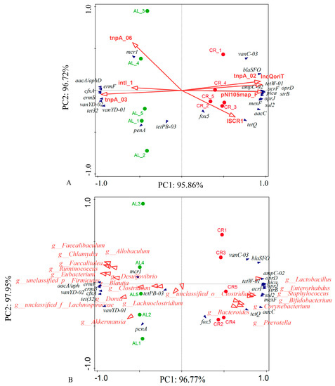 (A) RDA between ARGs (deep blue arrows) and MGEs (red arrows) in mouse feces; (B) RDA between ARGs (deep blue arrows) and gut microbiota (red arrows) in mouse feces (at genus level). The percentage of variation explained by each axis is showed, and the relationship was determined significant (p < 0.001) base on 499 permutations.