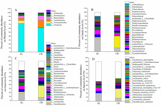 Effects of CR on gut microbiota in mouse feces. (A) On phylum level; (B) on family level; (C) on genus level; (D) on species level.
