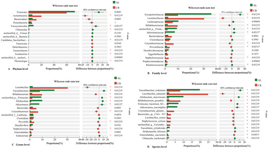 Wilcoxon rank-sum test of gut microbiota in mouse feces between AL and CR groups (*: p < 0.05).((A) Candidatus_Saccharibact…: Candidatus_Saccharibacteria; unclassified_d__unclassi…: unclassified_d__unclassified; (B) unclassified_p__Firmic…: unclassified_p__Firmicutes; (C) unclassified_f__Lachnosp…: unclassified_f__Lachnospiraceae; (D) Bifidobacterium_pseudolo…: Bifidobacterium_pseudolongum; Firmicutes_bacterium_M1…: Firmicutes_bacterium_M10-2; Corynebacterium_glutami…: Corynebacterium_glutamicum;unclassified_g__Coryneba…:unclassified_g__Corynebacterium).