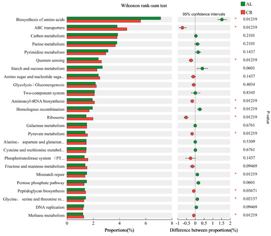Wilcoxon rank-sum test of abundance of functional genes in mouse feces between AL and CR groups (*: p < 0.05). (Amino sugar and nucleotide suga…: Amino sugar and nucleotide sugar metabolism; Alanine, aspartate and glutamat…: Alanine, aspartate, and glutamate metabolism; Cysteine and methionine metabol…: Cysteine and methionine metabolism; Phosphotransferase system (PT…: Phosphotransferase system (PTS); Glycine, serine and threonine m…: Glycine, serine, and threonine metabolism).