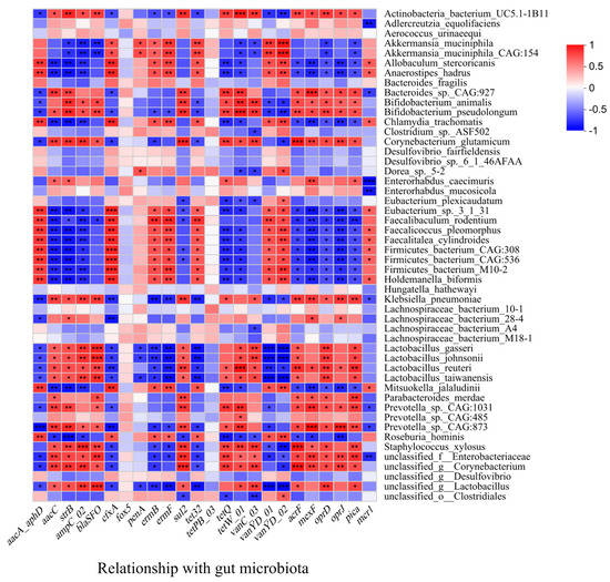 The Spearman correlations between gut microbiota and ARGs (at species level) (*: p < 0.05; **: p < 0.01; ***: p < 0.001).
