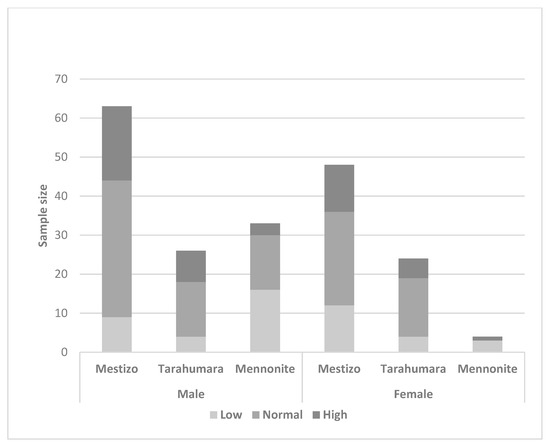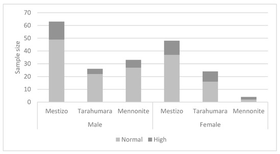 Our group’s main study determined the prevalence of metabolic syndrome (MS) risk factors in 1155 scholars that included 59.7% Mestizos, 24.7% Tarahumara, and 15.7% Mennonite. The prevalence of MS in the sample was higher in Tarahumara adolescents (12.65%) compared to Mestizo (11.95%) and Mennonite (7.15%), according to the ATP III criterion [28,29]. The significant statistical differences in the prevalence of MS in adolescents from the different ethnic groups in Chihuahua may include diet quality, behavior, physical fitness, and genetic (inherited polymorphisms) differences.