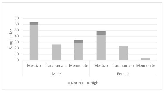 SBP showed elevated values for 9 males, as well as for 7 females, with non-significant differences among ethnic groups (males Chi2 (1, 2) = 3.187; p = 0.203; females Chi2 (1, 2) = 4.248; p = 0.120), (Figure 3).