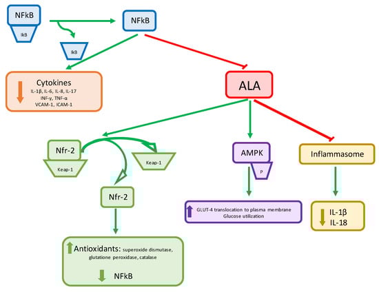 Firstly, it acts as an antioxidant. ALA and its reduced form, dihydro-lipoic acid (DHLA), act as scavengers of reactive oxygen species (ROS) [34] by stimulating the production of antioxidant enzymes, such as glutathione peroxidase and superoxide dismutase 1, inside mitochondria and endoplasmic reticulum via translocation of nuclear factor erythroid-2–related factor 2 (Nfr-2), preventing the decreasing of PPARγ protein [48] and protecting the cell from oxidative damage.
