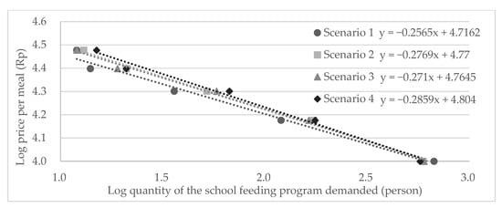 Across the four scenarios, 21–31% of the participants were willing to pay Rp 15,000 or higher per meal (Table 3). The more the benefits presented in the hypothetical school feeding program, the higher the WTP elicited. In all scenarios, the price elasticity of the school feeding program is approximately 0.3; thus, it is inelastic (Figure 2).