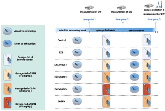The intervention protocol and experimental groups are shown in Figure 1. Briefly, one week before the intervention, all mice were accustomed to the exercise by swimming for 10 min per day, and the mice that could not swim were eliminated. Then, mice were divided into six groups (n = 10): control, EXE, EXE + 10SFN, EXE + 30SFN, EXE + 90SFN, and 30SFN. The intervention period lasted for two weeks. During the first week (the gavage-fed week), mice were gavage-fed with SFN of different doses (10, 30, 90 mg/kg BW) or the solvent as the control. In the second week (the exercise week), mice were subjected to swimming to exhaustion for seven days or just moving freely as a sedentary control. Mice swam in a round tank (100 cm in diameter, 50 cm deep) with 33–36 °C water, as suggested []. The exhaustion time point was determined when the mice failed to reach the water’s surface for 5 s and blunted righting reflex according to the Thomas and Marshall criteria []. After swimming, animals were dried, kept warm, and returned to their cages.