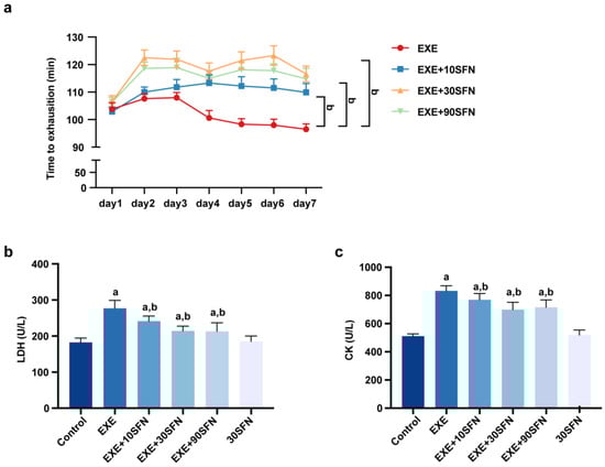 Swimming time is commonly measured as an index of exercise performance because mouse swimming constitutes treading water in a limited area, and the swimming distance is not measured or useful []. A longer swimming time indicates better exercise endurance and less susceptibility to fatigue. During the seven days of EE, every mouse’s swimming time to exhaustion was measured, and the results are shown in Figure 2a. In the EXE group, the time to exhaustion showed a downward trend in the exercise week for seven consecutive days, while there was no significant downward trend in the groups intervened by SFN. Through analysis by two-way ANOVA, the times to exhaustion of the three doses of the SFN intervention group were all significantly longer than that of the EXE group (p < 0.05 for the three comparisons); time to exhaustion was slightly longer in the EXE + 30SFN and EXE + 90SFN than in the EXE + 10SFN group (p < 0.05 for the two comparisons), but the time was not statistically different between the EXE + 30SFN and EXE + 90SFN groups (p = 0.2066). LDH and CK in the serum can be used to evaluate the degree of fatigue [,]. The concentration of LDH and CK were significantly increased in the EXE group compared with the control group but decreased with the all the three doses of SFN intervention (Figure 2b,c). No significance was detected in the LDH and CK levels between the EXE + 30SFN and EXE + 90SFN groups (p > 0.9999 in LDH, and p = 0.941 in CK). The above results suggest that SFN intervention can significantly enhance exercise performance and reduce fatigue in mice.