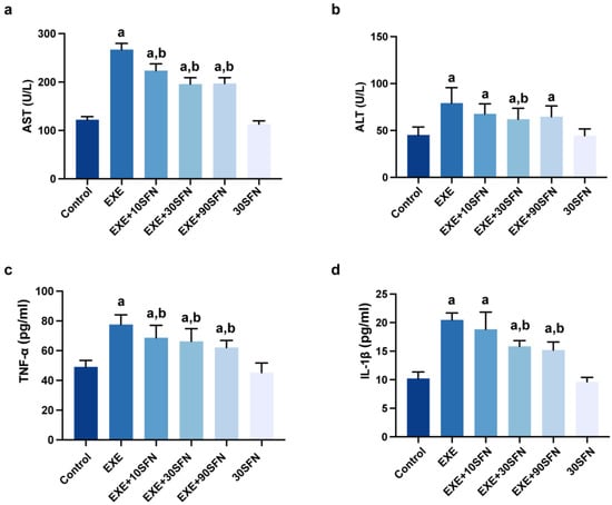 Sulforaphane attenuated EE-induced inflammation and liver enzyme elevation. (a,b) AST and ALT levels in the serum of mice after the exercise week. (c,d) The inflammation factors, TNF-α levels and IL-1β levels, in the serum of mice after the exercise week. (a: p < 0.05 vs. control group, b: p < 0.05 vs. EXE group.)