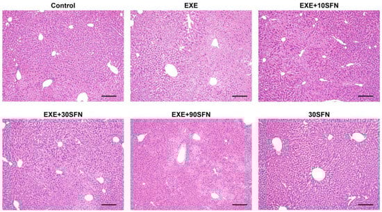 Pathological morphology of the liver was observed through H&E staining. The representative images of H&E staining are shown in Figure 4. In the groups that were not subjected to EE, i.e., the control group and the 30SFN group, the structure of the liver was intact without noticeable swelling, rupture, and inflammatory cell infiltration, while the liver of the mice subjected to EE showed noticeable cell swelling, unclear cell membrane boundary, tissue damage, and unclear liver cord. Although cell swelling and inflammatory cell infiltration were presented in the liver of the mice intervened by SFN, the degree of damage was lighter than that of the EXE group, and collagen hyperplasia could be observed in the damaged area of liver cells, suggesting that the liver was recovering after the injury.