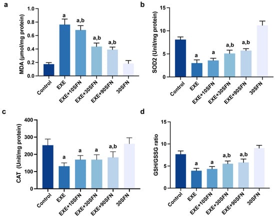 Sulforaphane attenuated EE-induced liver oxidative stress. (a–d) The MDA, SOD2, and CAT levels and GSH/GSSG ratio of the liver tissue after the exercise week. (a: p < 0.05 vs. control group, b: p < 0.05 vs. EXE group.)