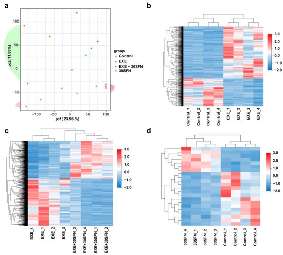 Transcriptome alterations of liver tissues of each group. (a) PCA of the gene expression of the control, EXE, EXE + SFN, and 30SFN samples. (b) The heatmap of DEGs between the control and EXE groups. (c) The heatmap of DEGs between EXE and EXE + SFN. (d) The heatmap of DEGs between 30SFN and the control.