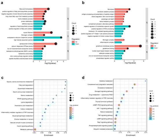 To explore the potential biological changes underlying the transcriptome alterations, we performed GO and KEGG enrichment analyses of the DEGs, as shown in Figure 6b,c. Taking FDR < 0.05 as the enrichment standard, the enrichment results of the upregulated and downregulated DEGs in EXE compared to the control are shown in Figure 7a. The enriched GO items in the EXE group were mainly concentrated in fat biosynthesis. At the same time, the genes downregulated in the EXE group were mainly enriched in fatty acid oxidation, defense response, nitric-oxide synthase regulator activity, etc., suggesting that EE might have an important impact on fatty acid metabolism and lead the body to a deleterious state, such as reduced defense response and reduced antioxidant ability. Comparing EXE with the EXE + SFN group, the enriched GO terms of the DEGs are shown in Figure 7b. The upregulated genes were enriched in items such as catabolism and autophagy. In contrast, the downregulated genes were enriched in the items such as inflammatory response activation and oxidase activity. The results suggest that SFN intervention can reduce the EE-induced liver inflammatory response and promote metabolism at the transcription level.