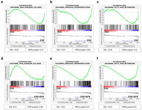 The GSEA results of the control and EXE groups and EXE and EXE + SFN groups. (a–c) GSEA was performed in the control and EXE groups. The TNF-α signaling via NFκb (a), oxidative phosphorylation (b), and fatty acid metabolism (c) was enriched in the EXE group. (d–f) GSEA was performed in the EXE and EXE + SFN groups. The TNF-α signaling via NFκb (d) was enriched in the EXE group, while oxidative phosphorylation (e) and fatty acid metabolism (f) were enriched in the EXE + SFN group.