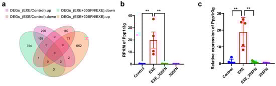 In order to find the potential key genes for SFN in the protective effects on EE-induced liver injury, the mutual DEGs of EXE vs. control and EXE + SFN vs. EXE were identified using Venn analysis, shown in Figure 9a. We focused on the genes that were elevated in EXE but decreased in the intervention of SFN and the genes that decreased in EXE but increased in the intervention of SFN. These genes were then ranked based on the foldchange, and the top 10 are displayed in Table 2, the most significant of which is Ppp1r3g, one of the catalytic subunits of the protein phosphatase 1 (PP1) holoenzyme []. qRT-PCR was then performed to validate the expression of the candidate gene, and the alteration trend was consistent with the RNA-seq result (Figure 9b,c). The other nine genes listed in Table 2 were also validated by qRT-PCR, the results of which are displayed in Figure S1. The qRT-PCR results of six genes (Tas1r2, Fbp2, Nr4a2, Gm11525, Hdc, and Gtse1) are consistent with the RNA-seq results. The expression of the other three genes (Crtam, Tex35, and Wnt6) showed no or less significant differences among groups, though they are in the same changing trend, suggesting that results of RNA-seq and qRT-PCR are in good consistency. Also, the results suggest that Ppp1r3g is the potential key gene of the protective effect of SFN on EE-induced liver damage.