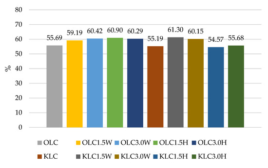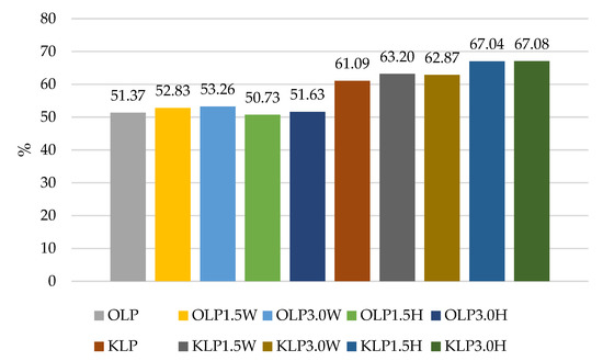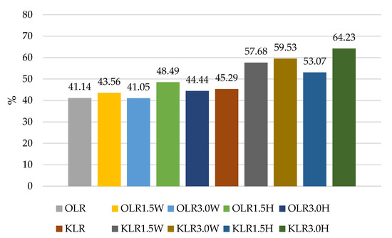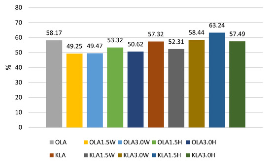 The survival rates of the L. acidophilus strain ranged from 49.25% to 63.24% (Figure 4). In this case, the addition of collagen and hydrolysate to ovine milk adversely affected the survival rate of this probiotic. In caprine milk, a better survival rate was found in milk with 1.5% KLA1.5H hydrolysate than control KLA, by about 6%. In contrast, the survival rate of L. rhamnosus was differentiated by the type of milk, and in caprine milk it ranged from 45.29% in KLR to 64.23% in KLR3.0H, while in ovine milk from 41.05% in OLR3.0W to 48.49% in OLR1.5H (Figure 2). Caprine milk also showed better survival of L. paracasei, especially with the addition of hydrolysate. Compared to KLP control goat’s milk, adding 3% hydrolysate increased the survival of L. paracasei by about 6% in KLP3.0H. In sheep’s milk, adding 3% collagen was more effective, increasing the survival of this strain by 2% in OLP3.0W (Figure 1).