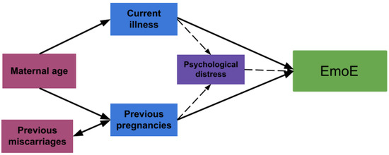 Regarding correlations with sociodemographic variables and how these may influence eating behaviors, we found that EmoE had a bivariate correlation with maternal age, which was neutralized in the multiple regression model by current illness and a higher number of pregnancies. This is expected, since the latter variables are more likely to be found in older women. It is important to note that EmoE was only minimally explained by current maternal illness, the number of previous pregnancies, and schooling. We suppose the associations with the first two variables could be at least partially mediated by some psychological or emotional factors we did not evaluate. Several studies have described that events or situations like previous pregnancy losses, the demands of caring for older children, and physical illness, are related to the presence of anxiety, stress, and depression during pregnancy [21,22,23]. These psychological traits are in turn associated with EmoE behavior [22,24,25]. Therefore, we may hypothesize that these sociodemographic variables explain EmoE, mediated by psychological variables (Figure 2).