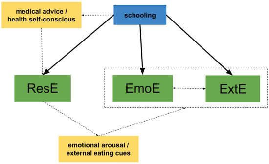 A hypothesis of maternal schooling explaining the restrained, emotional, and external eating behaviors.