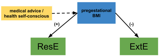 The antagonistic influence of BMI on ResE and ExtE may be in accordance with the second theoretical argument. It would be the result of weight-centered nutrition interventions offered to pregnant women at the Institute where the study took place and most likely elsewhere. The positive influence of pregestational BMI on ResE may be due to the fact that all women who start pregnancy with a BMI of 25 kg/m2 or higher, and/or experience excessive weight gain, are referred to the dietetics service to receive dietary guidance (i.e., caloric restriction). The negative influence on ExtE has been previously observed and, as other authors have discussed, it may be logical to expect an opposite association with BMI since individuals with high ResE scores are already exerting control over their ExtE drive, especially if they are receiving treatment or counseling to manage their eating habits and weight [15,26] (Figure 4).