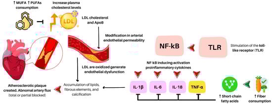 Atherosclerosis (ATE) is considered a principal cause of different coronary heart diseases. It is characterized by the accumulation of lipids, fibrous elements, and calcification within the large arteries, similar to a chronic inflammatory process [35]. This involves the stimulation of the toll-like receptor (TLR), which activates the transcription factor (nuclear factor-kappa beta), inducing the activation of proinflammatory components such as interleukin 1β (IL-1β), IL-6, IL-18, and tumor necrosis factor-alpha (TNF-α) [36] (see Figure 1).