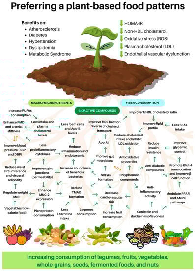 Many people consider a plant-based diet (PBD), which includes only plant sources with the absence or occasionally minimal presence of processed food, a novel and even risky eating choice. This concern is heightened by the potential deficiencies in micronutrients, such as vitamin B12 and D, calcium, omega 3, or iron, compared to a traditional diet [1,2]. However, over the past decades, a wealth of scientific evidence has accumulated that provides strong support for the potential health benefits of a PBD. These benefits include the prevention of various chronic non-communicable diseases, such as type 2 diabetes [3,4], hypertension [5,6,7], dyslipidemia [8,9], atherosclerosis, and cancer [10,11]. Studies on supplementation and natural consumption approaches have demonstrated the practical advantages of a PBD, which are attributed to the bioactive compounds present in plants, such as catechins [12,13], anthocyanins [14,15], polyphenols [16], and phytosterols [17,18], among others.