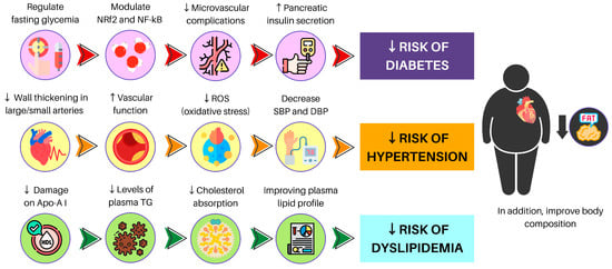 Additionally, previous evidence has shown that quinoa could decrease weight gain, improve lipid profile, and improve capacity to respond to oxidative stress, mainly due to saponins content [250]. Another study also showed decreased LDL cholesterol and TG after 30 days of quinoa bar consumption [251]. This has been supported previously [252]. Here, the authors found a 36% reduction in TG levels after 12 weeks of 50 g of quinoa consumption. The mechanism by which quinoa exhibits these benefits is not fully comprehended. However, their effects are related to fiber content, reduction in dietary fat absorption due to increased lipid content in feces, and/or bile acid activity. One crucial detail is that these changes in triglyceride reduction levels were comparable to the reduction evidenced in pharmacologic therapy that used 40% nicotinic acid, 35% fibrates, and 20% statins. Finally, Table 2 displays a summary of findings on NCCD and MetS, Figure 2 provides a comprehensive overview addressing the overall advantages of adopting a plant-based diet, and Figure 3 provides a synthesis addressing the general effects of adopting a plant-based food pattern against specific chronic non-communicable diseases.