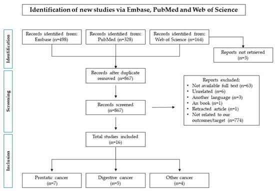 A total of 990 records were initially identified, of which 498 were retrieved from Embase, 328 from PubMed, and 164 from Web of Science. After the duplication removal, a total of 867 records were screened. 774 were excluded because they were not related to our outcomes/target/study design, 63 were not available as full-text, six were unrelated, three were in another language, one was part of a book and one was retracted. As a result, 16 studies were included. A complete representation of the screening process, including studies excluded for each step, is reported in Figure 1.