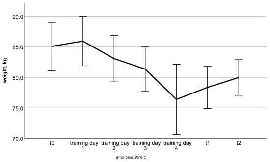 Participants achieved significant weight loss after 12 weeks of intervention (Table 2, comparison t0–t1 and Figure 1), which was still significant after the follow-up period (t0–t2: −4.9 ± 5.4 kg; p < 0.001; data are not presented in Table 2). The range of weight loss during the intervention period was −14 kg to 0.3 kg; however, when outliers (values further than ±2 SD from the mean) were excluded (n = 2), this was reduced to 11.2 kg.