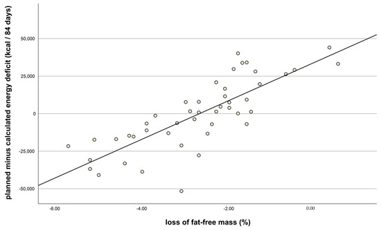 Loss of fat-free mass after intervention (%, t1) vs. planned minus calculated energy deficit (kcal) after 84 days (kcal), as indicated by food diaries. Correlation coefficient: r = −0.8; n = 46; p < 0.001.