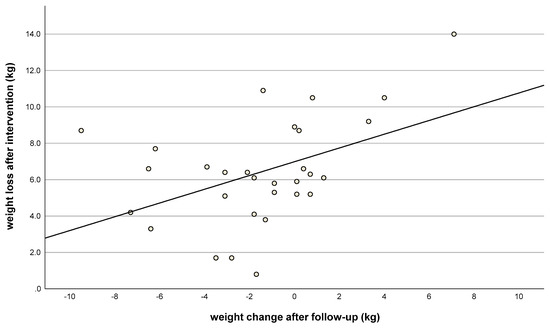 Weight loss after intervention (kg, t1) vs. weight change after follow-up (kg, t2). Correlation coefficient: r = 0.45; n = 30; p = 0.01.