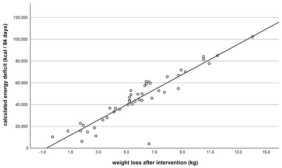 Weight loss after intervention (kg, t1) vs. calculated energy deficit after 84 days (kcal), as indicated by food diaries. Correlation coefficient: r = 0.9; n = 46; p < 0.001.