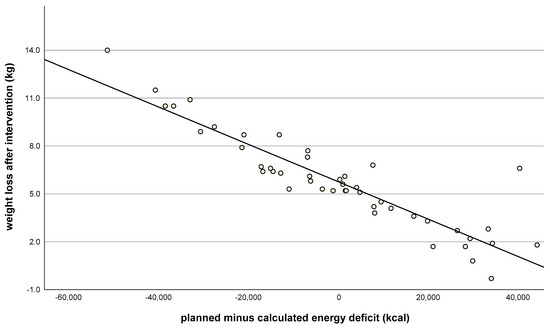 The first food diary (given after the first training session) was kept and submitted by all but two of the women. The second (given after the third training session) was not submitted by four. If data from the food diaries were not available, the completed meal checklists at times corresponding to the food diaries were used as a substitute: these were available for 45 of 46 women. There were no significant differences between the real energy deficits (calculated by the food diaries) and the predicted energy deficits (calculated by the body weight planner): 6 ± 277 kcal/24 h (25 ± 1159 kJ/24 h); p = 0.886. Additionally, predicted individual energy deficits correlated with weight loss (r = 0.9, p < 0.001, Figure 4). Where there was a greater difference between the planned and real energy deficit (with the actual energy deficit lower than planned), weight loss was also lower (Figure 5). This suggests that better compliance to the energy deficit target resulted in better weight loss, closer to the desired 5–6 kg.